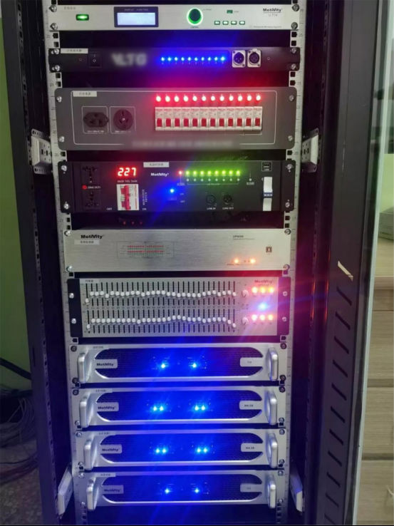 报告厅内配置了一套U-T14无线桌面式会议系统,方便人员进行会议报告时使用。同时,搭配了H系列和C系列功放、MA1210-F调音台、DP8080数字音频处理器、GEQ230均衡器、CP382和SC-802电源时序器,集中在设备房进行管理,既保证高品质的声效输出、保持系统的稳定运行,又实现人员的实时便捷操控。