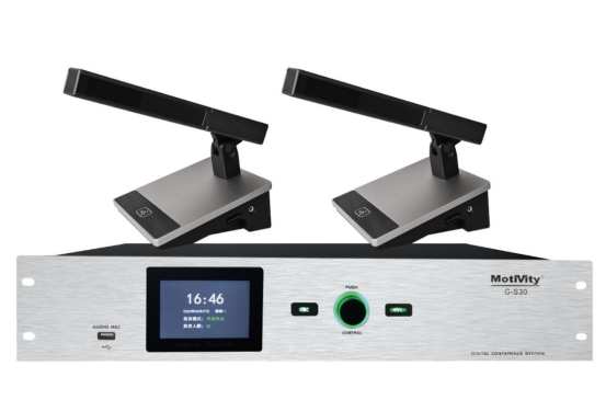 发言系统融合“有线+无线”的双重优势,提供既稳定又灵活的会议体验。有线部分用的是G-S30数字会议系统,其核心亮点在于一台装备了3.5寸全视角电容显示屏的系统主机G-S30,不仅直观显示各项参数,还极大地方便用户即时调整。单元G-T32采用主流的方型咪杆,可调俯仰角度,“手拉手”连接方式及符合人体工程学的金属面板设计,整体高档庄重。
