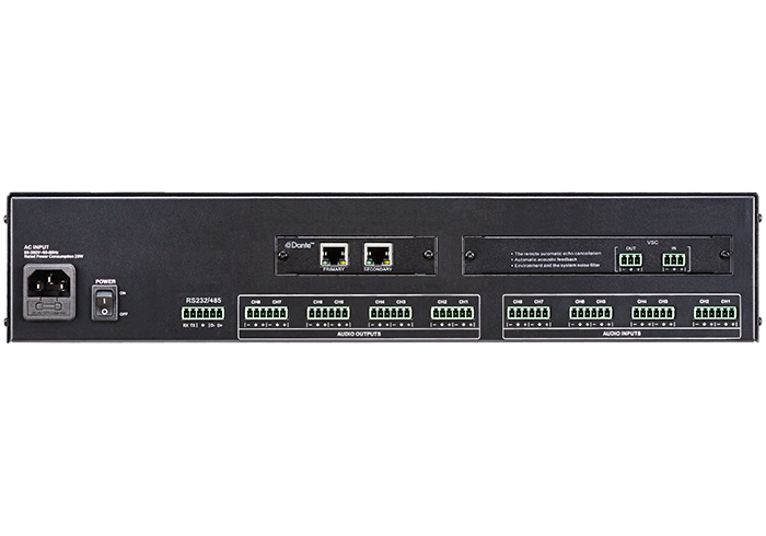 产品功能:32位DSP芯片处理,96kHz采样率,24bit AD/DA转换。1 8 x 1 6通道的全混音矩阵设计,其中包含8个本地模拟平衡Line/MIC输入通道、8个本地模拟输出通道、可通过选配DT88网络音频插卡扩展8个D a n t e网络输入通道和8个D a n t e网络输出通道、1个A U X内部混音通道、1个双效果器内部编组通道。本地每输入通道可选择独立话放带+48V幻像供电,话放增益可单独调节。支持AES67技术标准,可跨协议、跨网段音频互通;内置AEC实现远程电视电话会议中回声消除的能力,具备自动混音、自动增益控制、自动反馈抑制、噪声抑制等功能;输入通道处理部分包含低切,独立反馈抑制(8级),8段参量均衡,噪声门,增益,静音,相位,连动调节,音量编组调节等处理功能。输入部分拾音