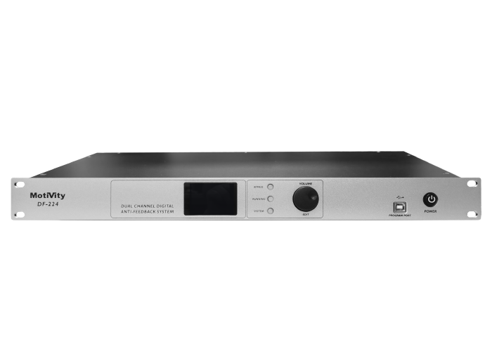 抑制器DF224 此反馈抑制器是一款数字双通道专业反馈抑制器,采用专业DSP算法实现啸叫消除,操作使用极其简单,可通过前面板显示屏进行操作调节显示,也可以通过专业PC软件进行操作;具备双通道24段高精度数字陷波器,可精准的自动检测并锁定反馈点,在反馈产生前的一瞬间,人耳没有听到前对反馈频率进行精确的足够的衰减以制止反馈产生。同时,具备场景保存及调用功能,现场使用更便捷灵活,可应用于各类会议室、会议厅、报告厅等场合;技术参数:输入阻抗:20 kΩ输出阻抗:22 kΩ频率响应:20 Hz - 20 kHz (+/- 0.5 dB @ 1 kHz)总谐波失真(THD):0.01%,1kHz连接器:2个XLR ,2个1/4" TRS最大输入电平:15dBu最大输出电平:14dBu输入灵敏度