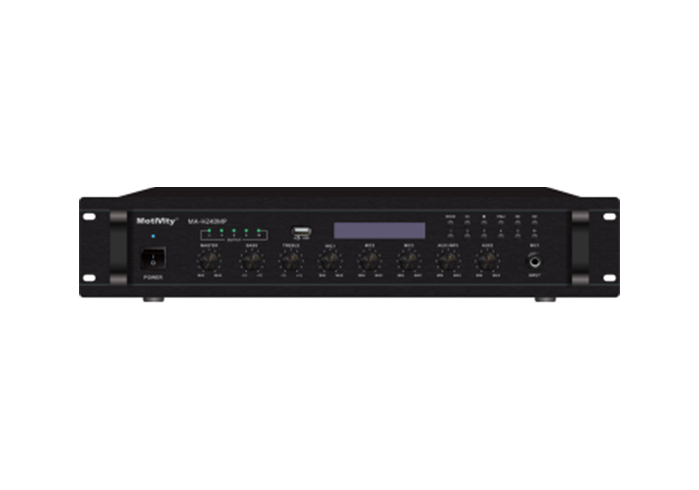 高档铝质标准2U机架,黑色氧化拉丝面板;内部PCB全部采用双面SMT贴片电路,性能更稳定可靠;五路信号输入(三路话筒、二路线路);内置蓝牙5.0无线音频接收,接收距离空旷可达10米;自带U盘插口及遥控控制,上电自动播放功能;内置FM调频收音机及遥控控制功能;七位荧光显示屏,全功能轻触式按键;设有100V、70V定压输出和4~16Ω定阻输出;总音量调节功能,各输入通道音量独立调节;高音、低音独立调节;MIC1自动默音设有调节开关,可调节范围:0到-30dB;五单元LED电平显示,动态明朗;具有完善的输出短路保护和超温保护功能;散热风扇温度控制启动;输出方式:4-16Ω定阻输出 70V(19Ω) 100V(39Ω)定压输出;话筒输入:MIC1/MIC2/MIC3: 600Ω 5-8 mV ,非平衡;线路输入:AUX
