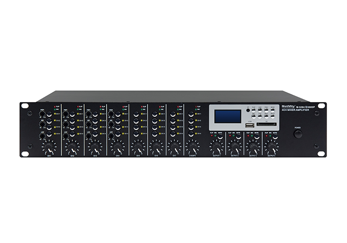 八进四出混音音频矩阵,任意八路输入通道音源可以自由分配混音到四路音源输出。矩阵主机具备多媒体播放功能,支持USB / SD / Bluetooth / FM播放模式。矩阵主机自带四通道功放输出,可直接与喇叭连接。整个矩阵主机形成一个高度集成化的小系统,只要输入音源,连接喇叭,音乐就能直接从喇叭播放出来,不需要额外的功放设备,节省空间,系统更简化,用户使用更加方便、快捷、灵活。