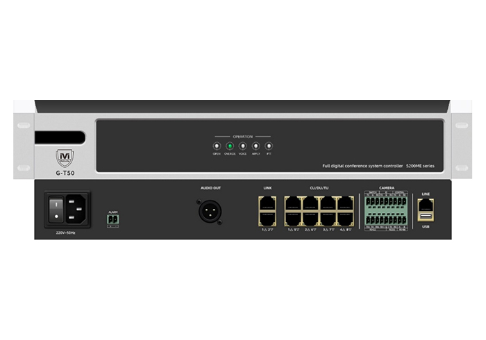 全融合型高端数字会议系统,内置双处理器,通过网线进行传输,包括数字音频信号、数据信号及控制信号,具备高品质音频信号;主机可通过软件进行系统设置、音频处理调节、会议设置(包括会场设置、会议通知)、单元监测、会议服务、签到表决等;支持全数字有线单元及5G WIFI无线单元的同时接入使用;单元容量无限制,线路过长或单元数量过多时,可通过电源扩展器进行扩展;会议保密性强,支持WPA/WPA2无线安全技术;完善的DSP处理功能,包括PEQ,可支持10段参量均衡、31段图示均衡;两种采样率可选:32KHz、48KHz;多种会议发言模式,包括开放模式、声控模式、先进先出、后进先出、按住发言、申请发言模式,并具备对应的会议模式指示灯;支持发言人数及发言时间限制功能,支持1-6人同时发言、1-240分钟发言时间设定及0-60秒发